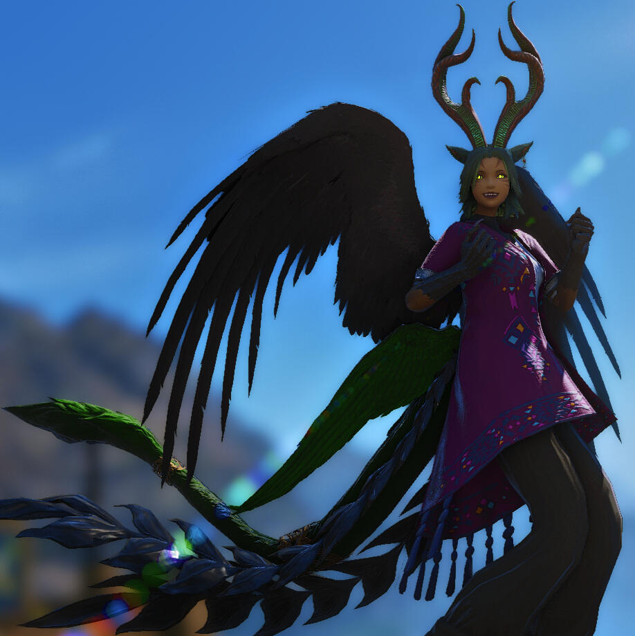 BIRTHPLACE: The Allagan EmpireAPPEARANCE: What looks to be mostly Miqo'te body, is broken up by the jarring addition of various creature parts. A living chimera, with draconic claws for hands, harpy wings, alkonost horns, slitted eyes and a whipping Ra-la tail, it's hard to tell how much is still the Miqo'te, or if it was even the framework to begin with.PERSONAL STYLE: What style the creature may have had once is long gone. For now, they wear what they can find.PERSONALITY: Bright, chirpy, and playful, they have some understanding that the world they knew is long gone and never coming back. After watching adventurers wantonly kill all the other Chimera in the facility, she is a little wary of people wielding weapons around her. She has a habit of stealing other people's voices, disgruntled that she can't quite get it correct, as if driven by a need to.BackgroundThere was once a Miqo'te, during a time long lost to history. In the height of the Allagan Empire's decline, desperate souls may have signed themselves up to be experimented on to further Chimeric research, in exchange for protections. The reasons varied, to protect homes, families, or to avoid being put to war. But it all ended the same, history was at least able to record that much.Limited by the Allagan tech wrapped around her wrists and neck, the creature was held in stasis until adventurers finally breached The Aetherochemical Research Facility in Azys Lla while in conflict with the Garleans. Released as a defense mechanism, this creature decided to hide rather than fight, watching as all the other chimera were slain. She waited until all fighting has ceased before slipping out into this new world, one without her doctor or their directive.